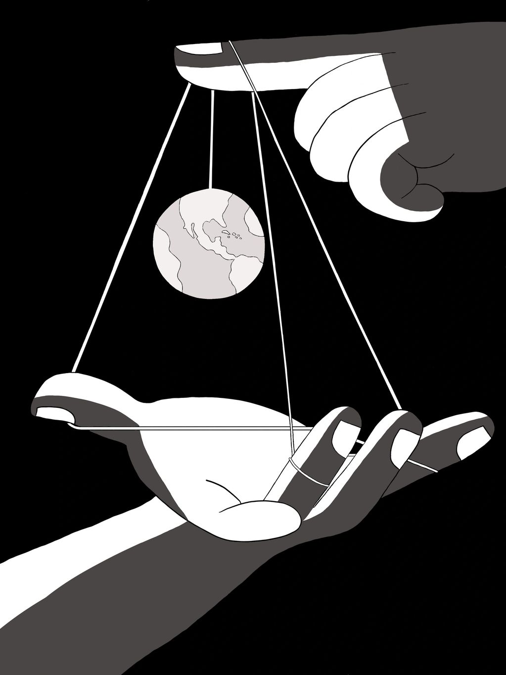 The idea behind this project was to create a metaphor through imagery. I chose to focus on human impact and interaction with Earth. I used giant hands to symbolize the powerful effect humans have on the planet, and Earth is essentially "hanging on by a thread." There is another meaning, similar in message, that uses a popular yo-yo trick called "Cat's Cradle" to represent how humans hold Earth "wi